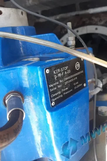 The blades are equipped with a simultaneously activated safety tip brake, and on top of these blades braking mechanisms, the WTG is fitted with a disc brake. The disk braking mechanism is supplied through two hydraulic fail-safe brake calipers, it activates by detecting a reduction of the voltage. The tip brakes are held in position by a hydraulic cylinder. In emergencies, a hydraulic valve is activated by centrifugal forces, and both brake systems are engaged, independent of each other.